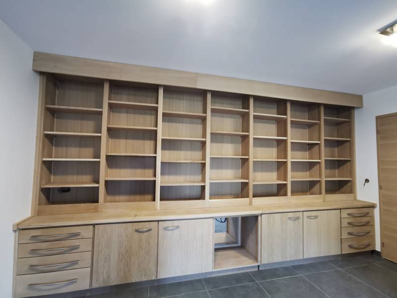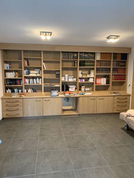 Fourniture et pose d'une bibliothèque en chêne de France traité ébénisterie Larg 4480 x Haut 2500 environ, reposant sur plinthe CTBX Haut 70 qui doit être recouvert de carrelage (vos plinthes).