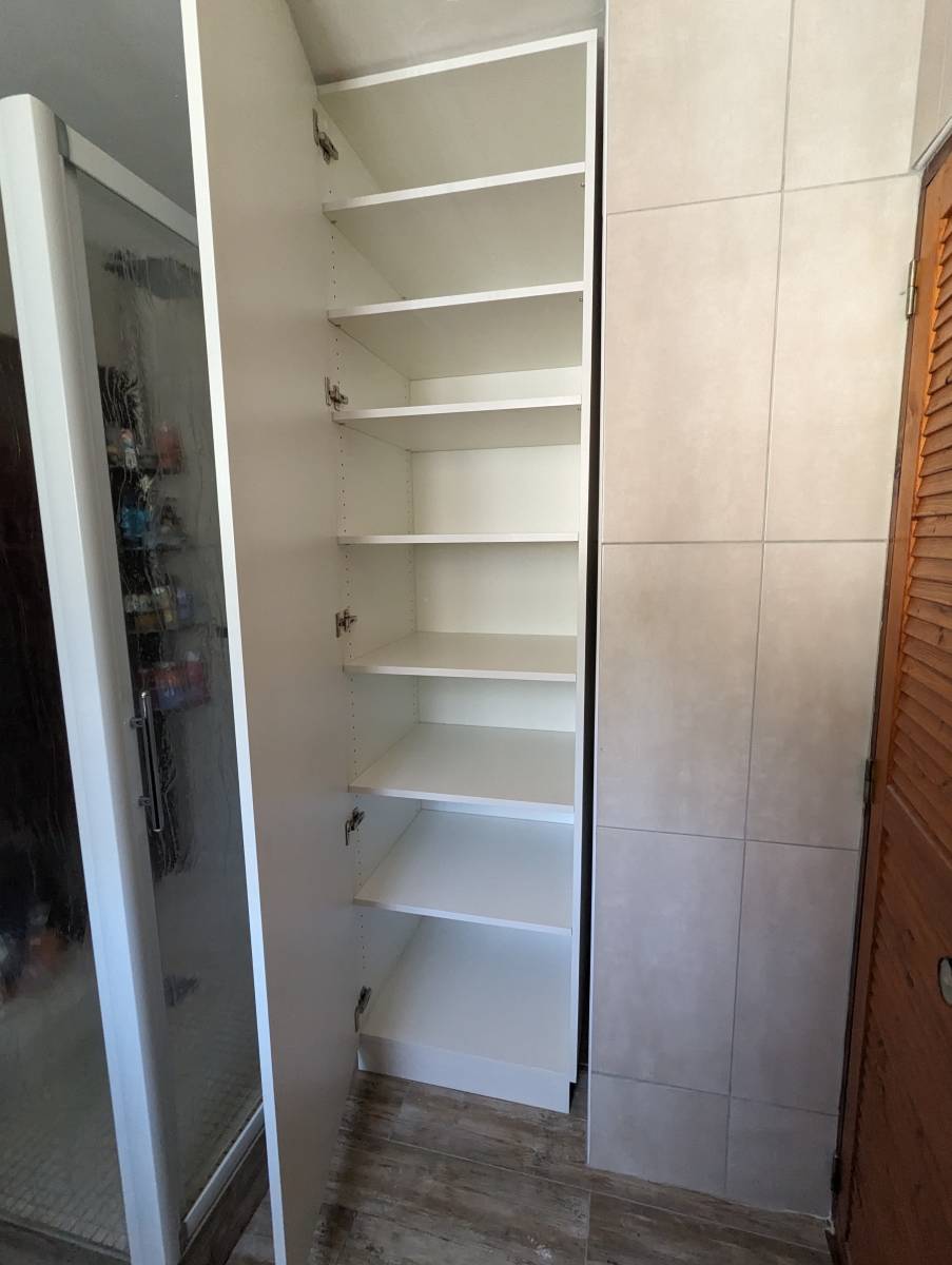 Confort Habitat à réalisé la fabrication d'un meuble sur-mesure en panneaux à particules surfacé mélaminé coloris blanc Hydrofuge épaisseur 19mm, 1 porte gauche tirant et 7 étagères réglables